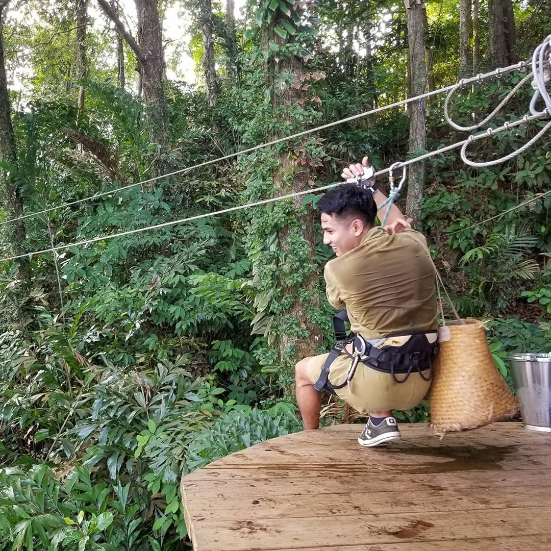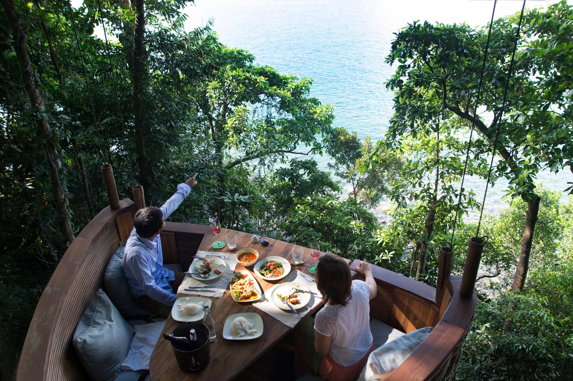 Pra completar a aventura e poder servir as mesas, os garçons se movimentam por meio de uma tirolesa. Eles levam a comida dentro de recipientes artesanais feitos por locais e que são acoplados nas mesmas cordas em que estão pendurados.