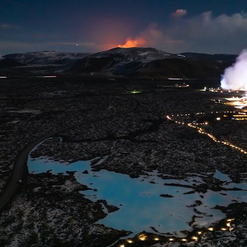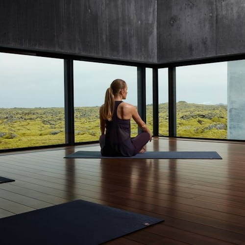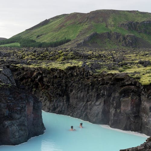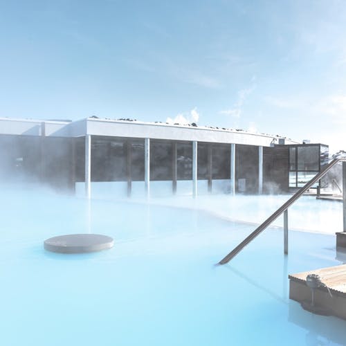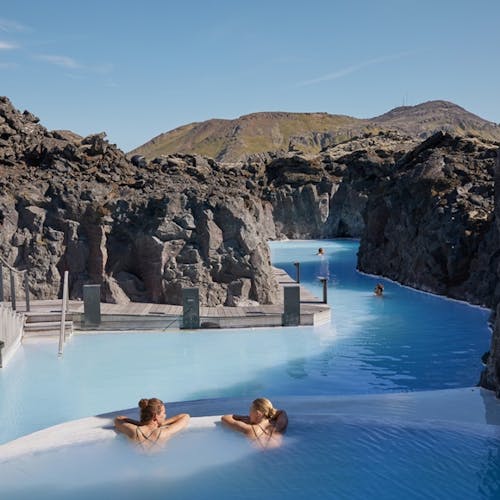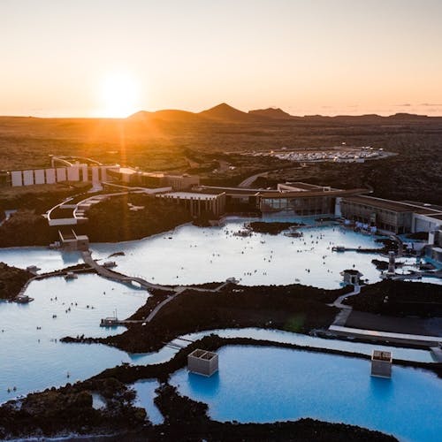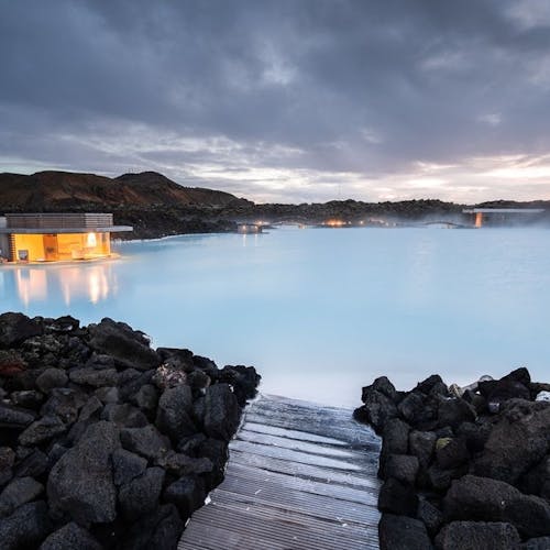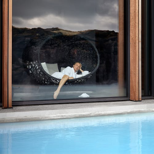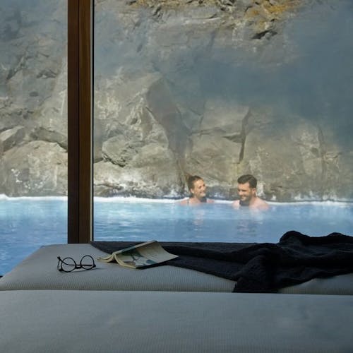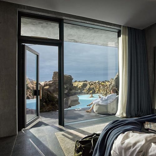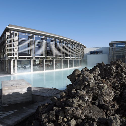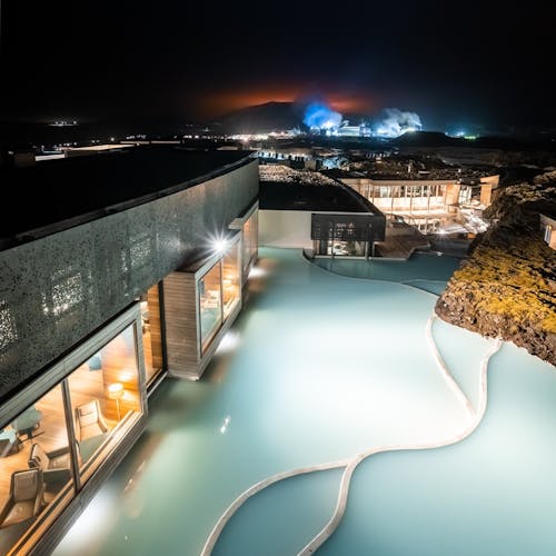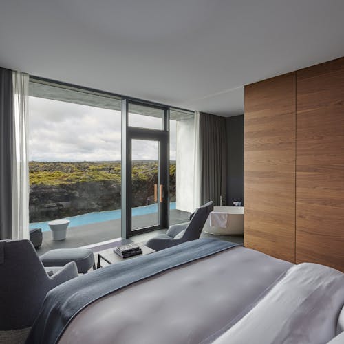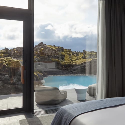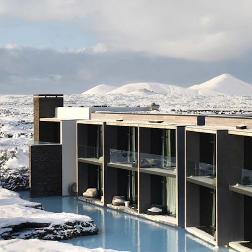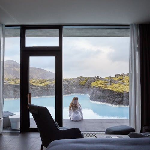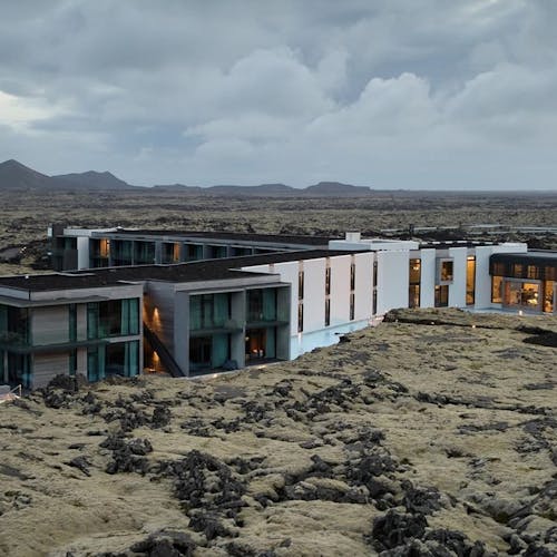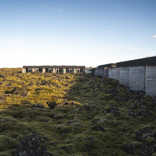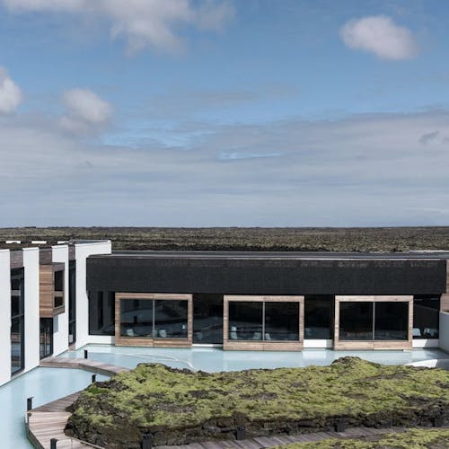 O complexo de hotel fica dentro do espaço da lagoa no Geoparque Global, é cercado por lava coberta de musgo de 800 anos e tem uma vista deslumbrante em qualquer época do ano, das lavas, montanhas e da lagoa.