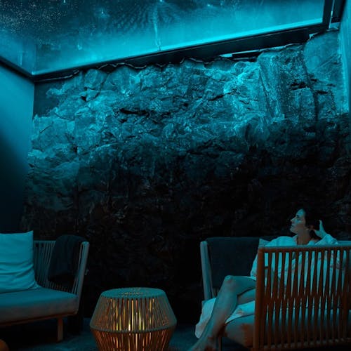 Um hotel de luxo com 62 quartos, um spa subterrâneo, cercado de uma lagoa rica em minerais e três restaurantes.