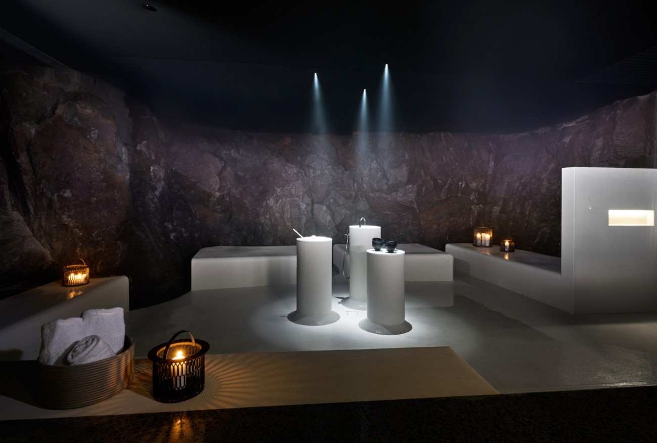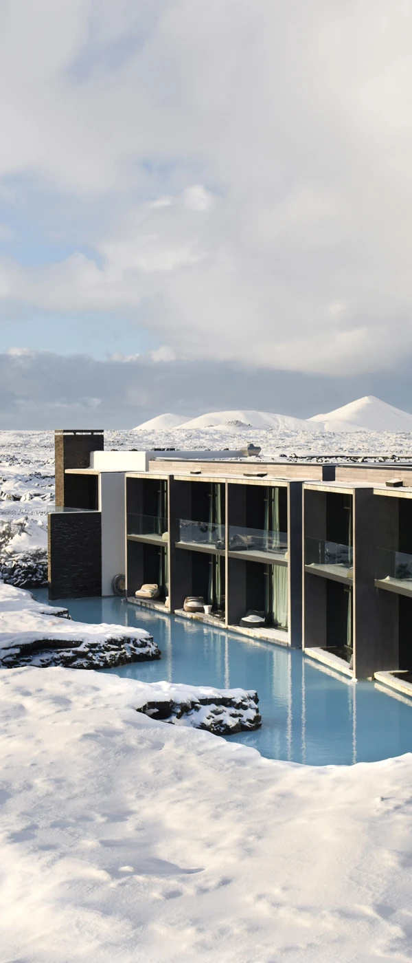 Um hotel de luxo com 62 quartos, um spa subterrâneo, cercado de uma lagoa rica em minerais e três restaurantes.
