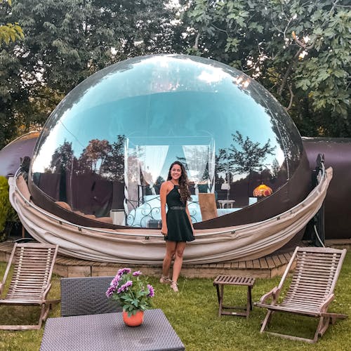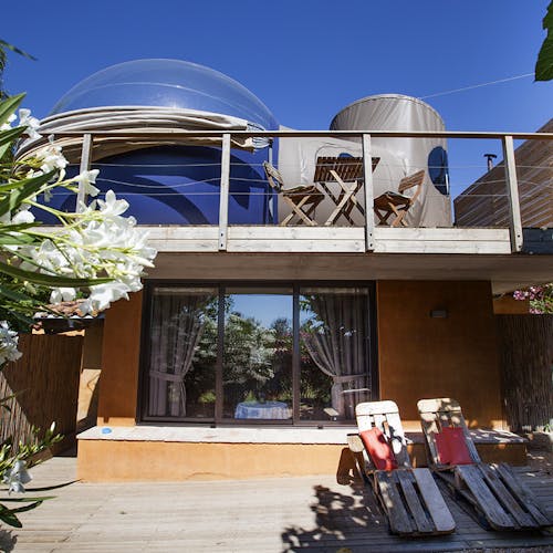 Bubble Spica Duplex: Bolha no último andar da construção de 43m² e jardim de 55m². Composto sala, lareira e banheiro com banheira. Varanda exterior e virada a nascente. É o quarto superior de todas as Bubbles, visto que é um quarto duplex, no qual no piso inferior tem uma sala com lareira, banheiro com banheira e um jardim privado de 55m². Uma escada em espiral leva ao segundo andar, onde o quarto bolha e a varanda estão localizados.