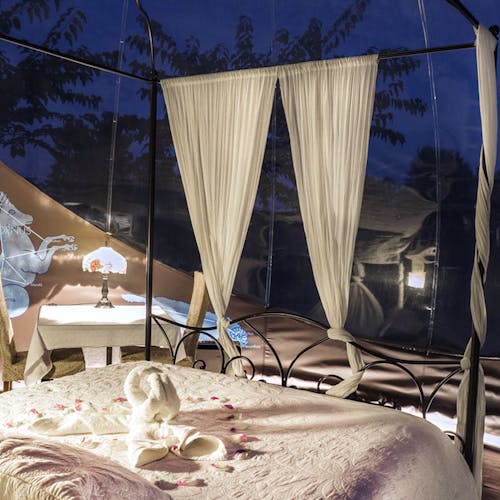 Bubble al Jadí: 30 m² são 3 bolhas unidas. É composto por quarto, sala de jantar e banheiro. Vista para um grande jardim totalmente privado, com mesa e cadeiras para uma bebida ao ar livre ou jantar. Você pode observar diferentes estrelas e constelações dependendo do mês do ano e da posição da Terra, e tudo sem sair da cama. Há toldo retrátil para cobertura da bolha, ar condicionado, aquecedor e iluminação interna e externa.