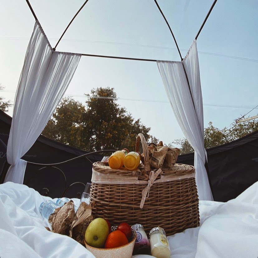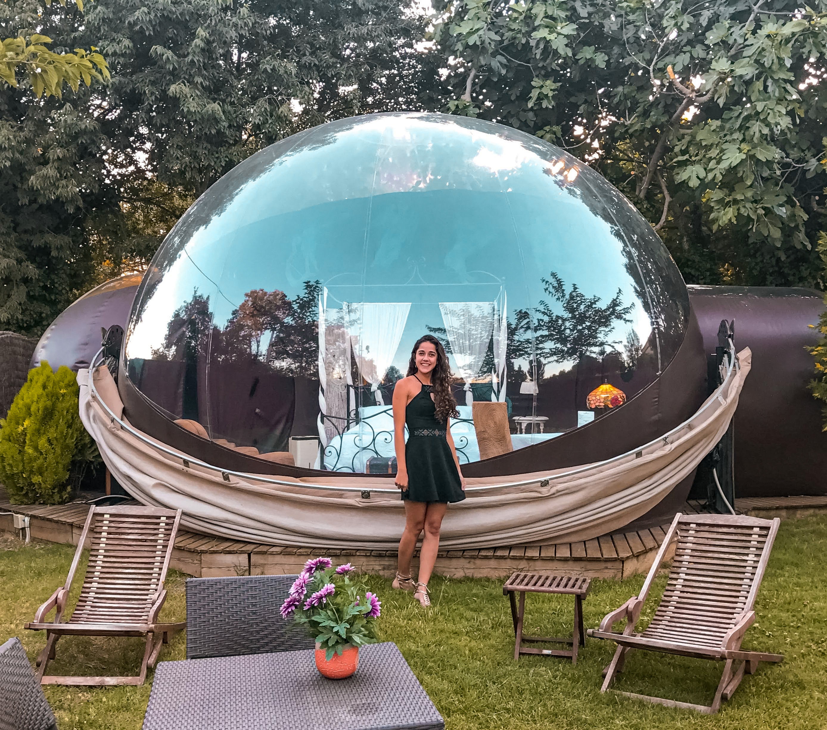Bubble al Jadí: 30 m² são 3 bolhas unidas. É composto por quarto, sala de jantar e banheiro. Vista para um grande jardim totalmente privado, com mesa e cadeiras para uma bebida ao ar livre ou jantar. Você pode observar diferentes estrelas e constelações dependendo do mês do ano e da posição da Terra, e tudo sem sair da cama. Há toldo retrátil para cobertura da bolha, ar condicionado, aquecedor e iluminação interna e externa.
