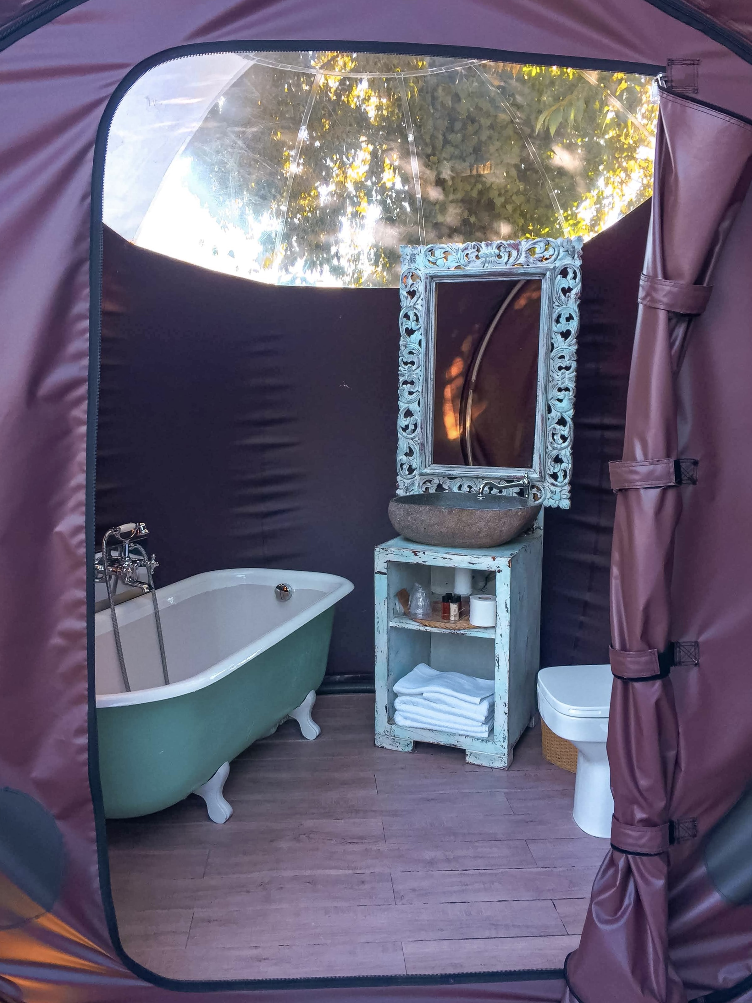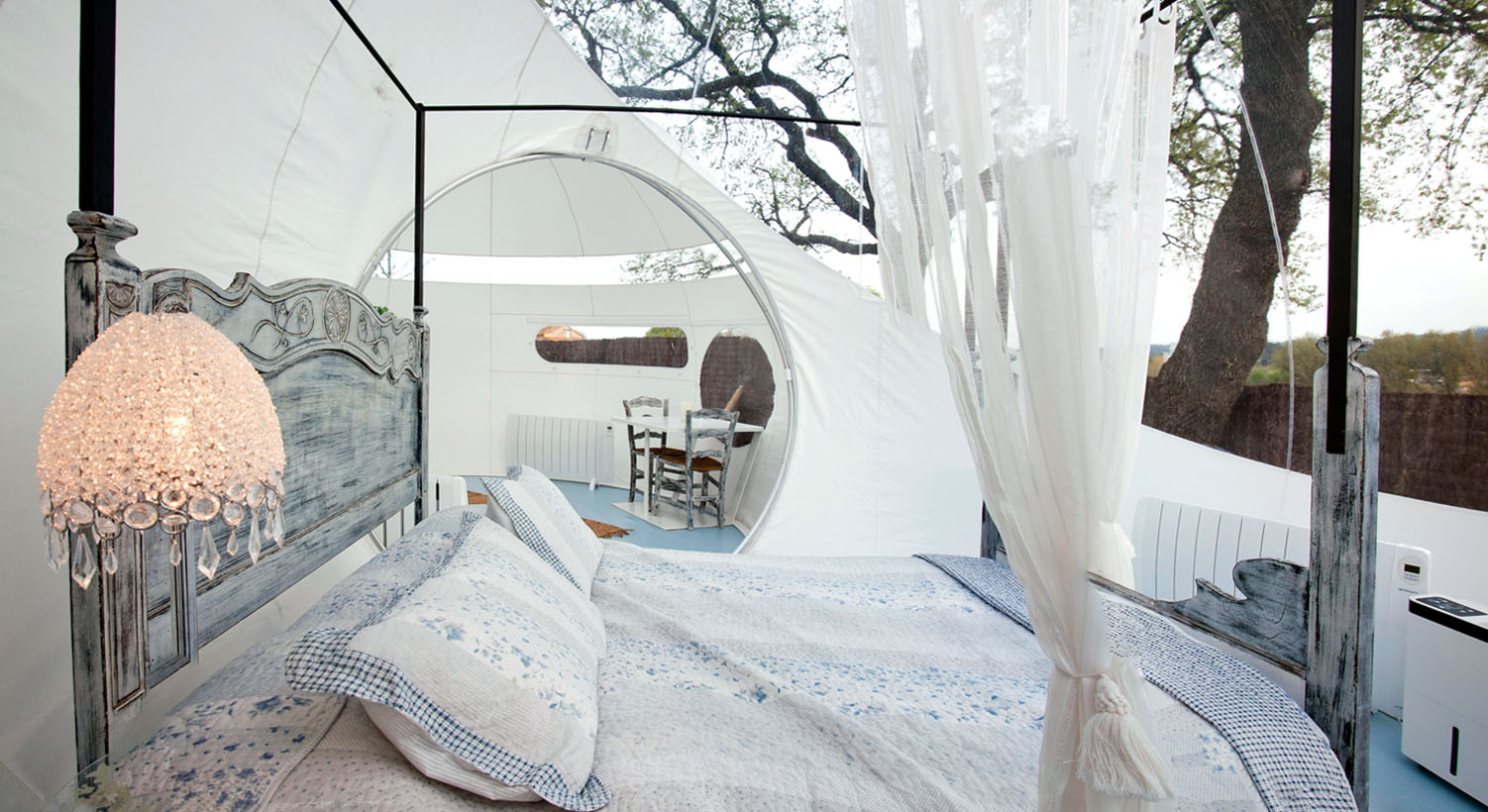 Forest Bubble: Bolha florestal de 26 m². Composto por 3 bolhas interligadas entre si com banheira na sala central, estacionamento privativo e jardim privativo de 400m2. Os quartos na floresta foram pensados para ter total privacidade, tranquilidade e independência, por isso têm uma banheira para desfrutar do relaxamento e duas bicicletas para fazer percursos. Este quarto inclui jantar e café da manhã. O jantar é composto por um menu de degustação de 6 pratos e sobremesas, com produtos sazonais. Além disso, a bolha está equipado com geladeira, cafeteira, frigobar e cesto com várias garrafas para fazer gin tônica e outras combinações, vinho e lanches. O café da manhã tem croissants, pão quente e frios e são servidos pela manhã. O menu é feito diariamente em função da época e da variedade da cozinha e está adaptado a qualquer intolerância ou alergia, assim como a vegetarianos e veganos.