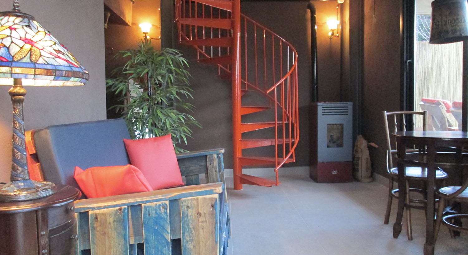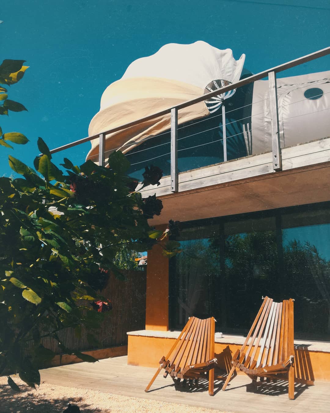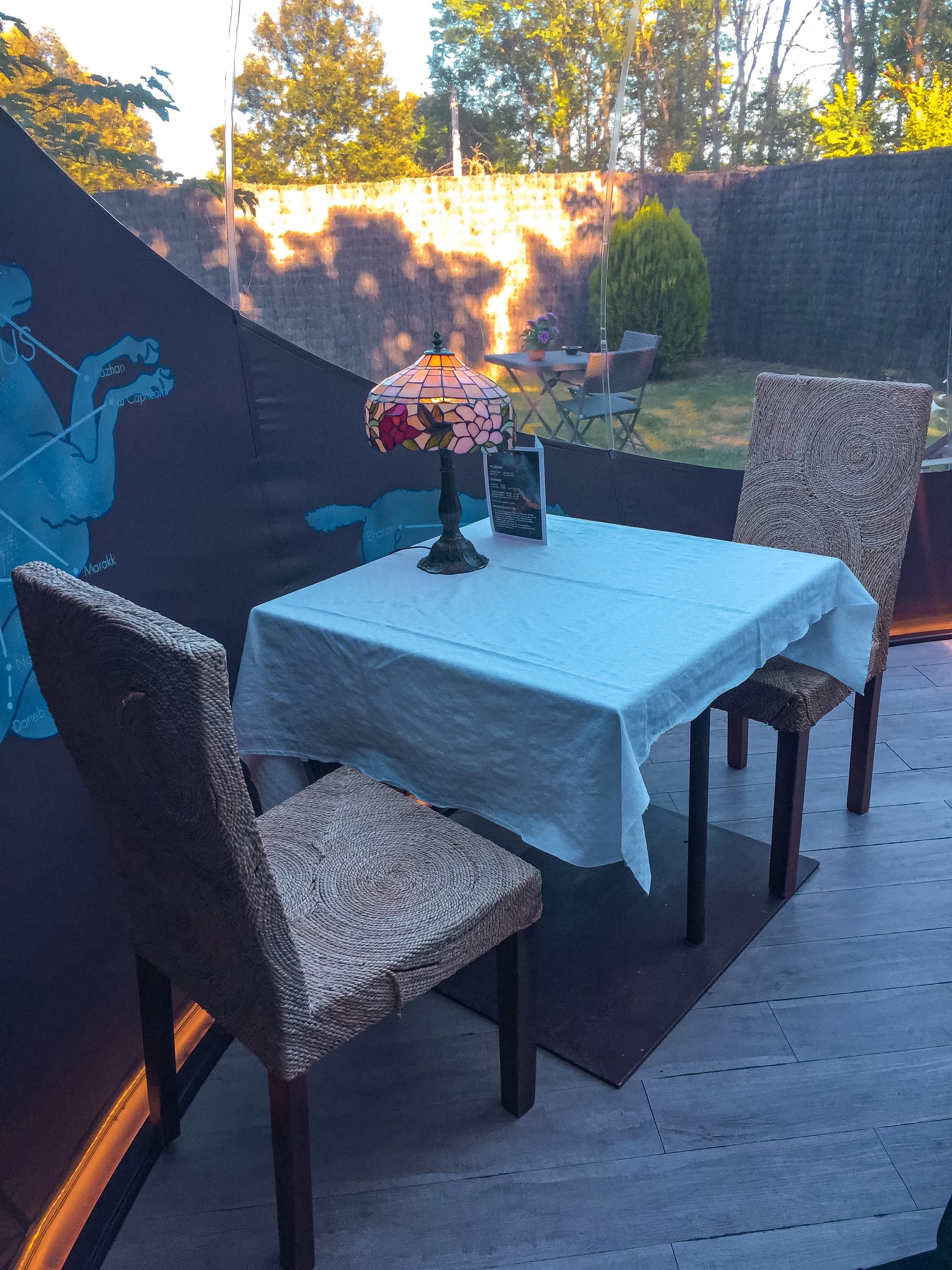 Bubble Spica Duplex: Bolha no último andar da construção de 43m² e jardim de 55m². Composto sala, lareira e banheiro com banheira. Varanda exterior e virada a nascente. É o quarto superior de todas as Bubbles, visto que é um quarto duplex, no qual no piso inferior tem uma sala com lareira, banheiro com banheira e um jardim privado de 55m². Uma escada em espiral leva ao segundo andar, onde o quarto bolha e a varanda estão localizados.