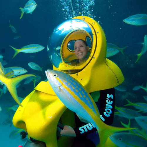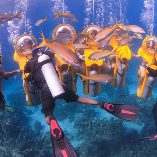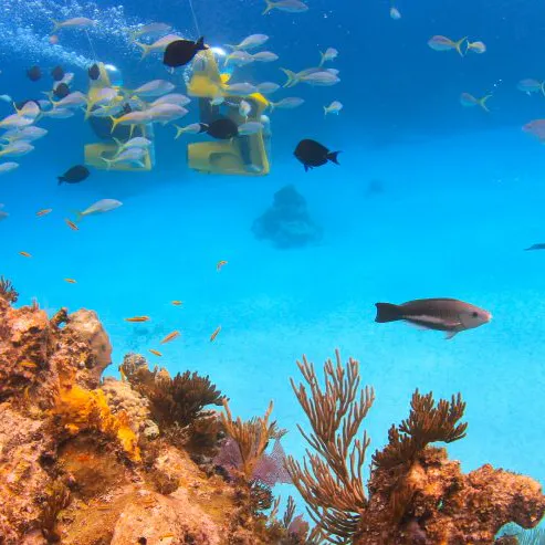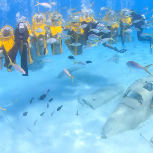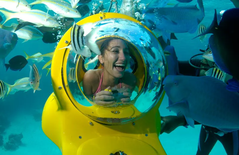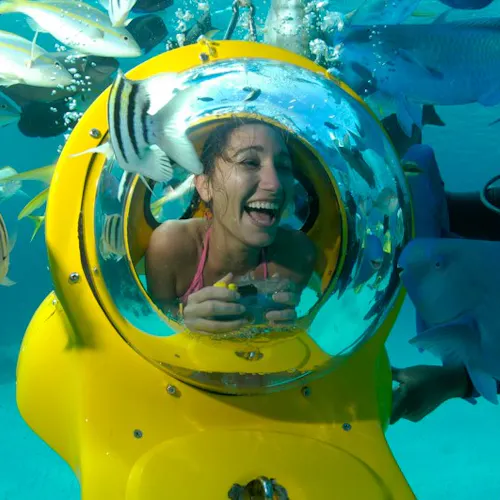 Sobre um mini submarino, você irá curtir essa experiência divertida e ter a oportunidade de ver a vida marinha de forma livre nas águas cristalinas do Caribe.