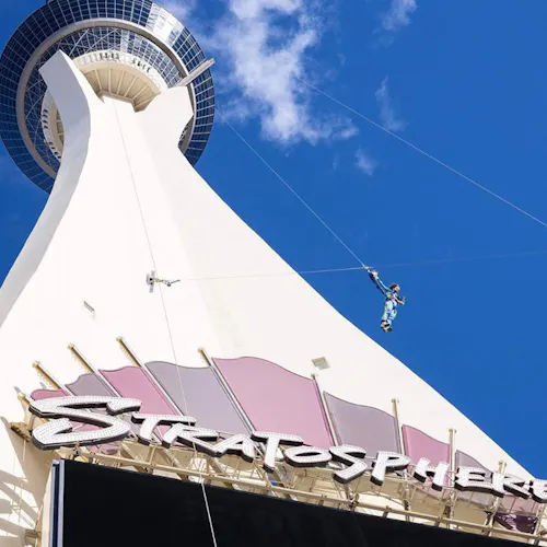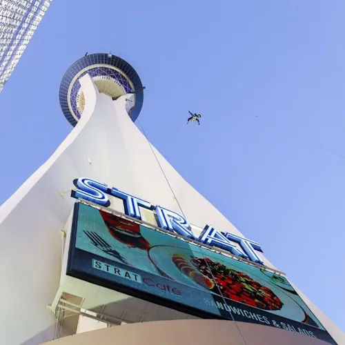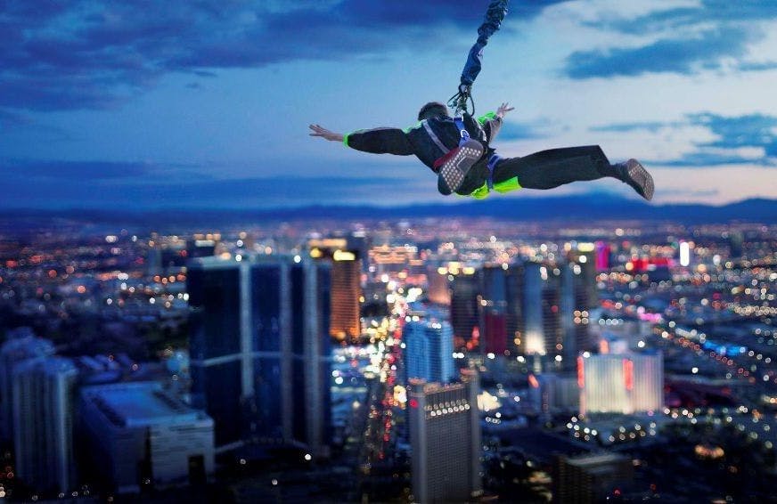 Diferente da maioria dos bungee jumps normais, o SkyJump é baseado em uma máquina descendente que faz a maioria do processo. Antes de começar, o saltador participa de uma aula explicativa. Logo após é conduzido por alguém da equipe que prepara a roupa e equipamentos e o leva o topo, onde é preso a todos os cabos. Ao receber o ok, é conduzido agora pelos cabos até a ponta da passarela, faz uma contagem regressiva e se joga apreciando o visual de Vegas. No fim da descida, a máquina diminui aos poucos, a velocidade o que faz com que a pessoa pouse de forma mais suave no chão, portanto apesar da adrenalina, ainda é mais tranquilo que um bungee jump livre e preso pelos pés, aqui os cabos o seguram pela cintura e pernas.