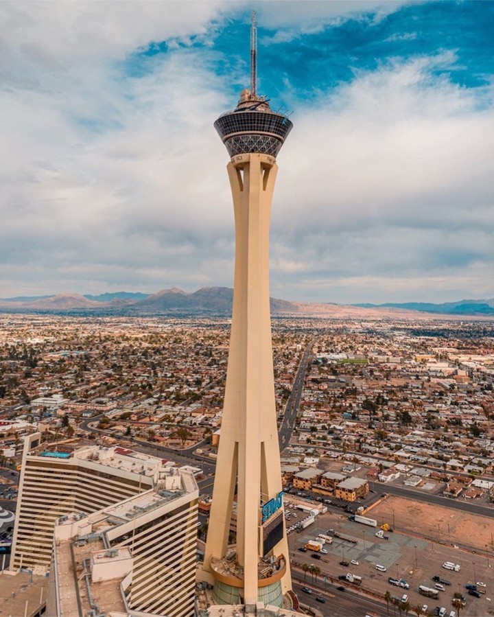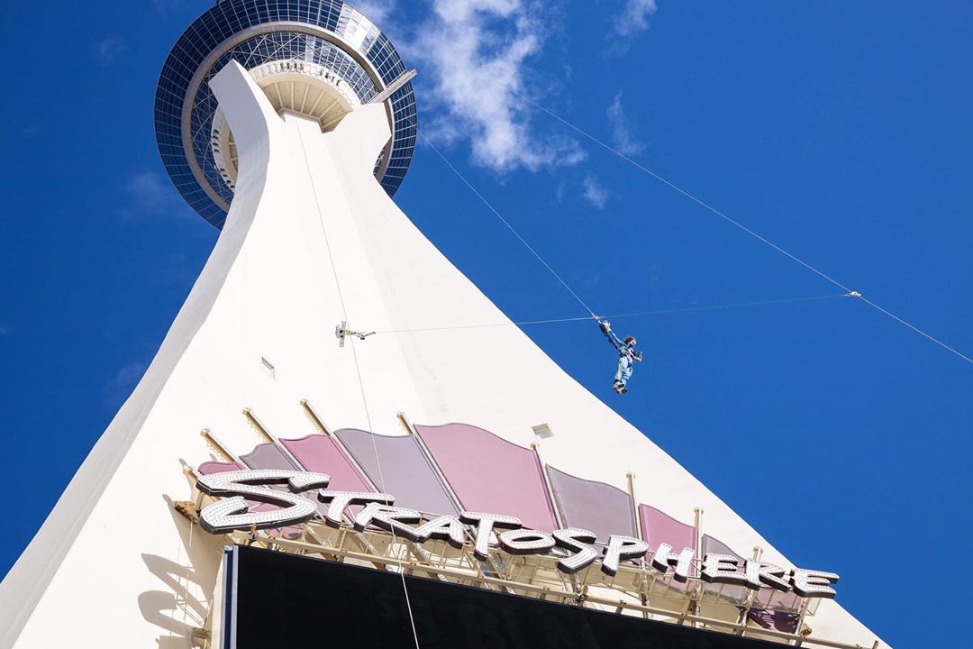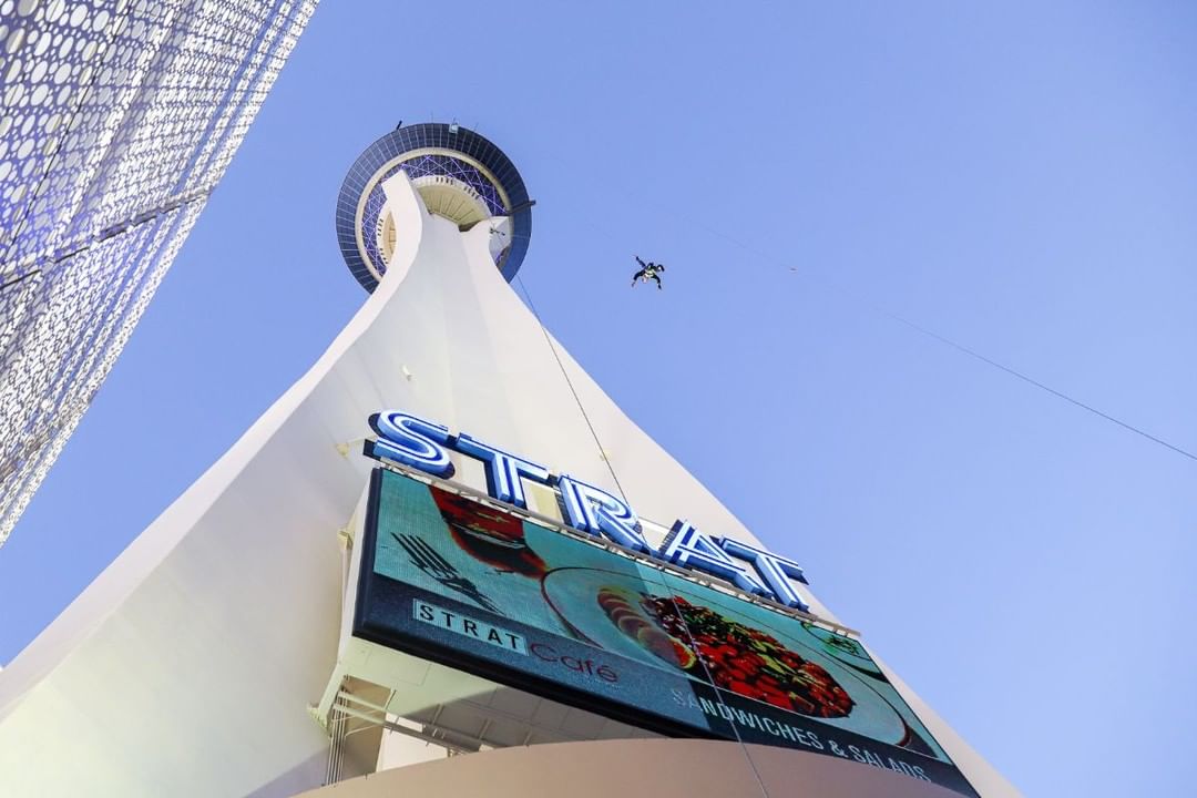 Diferente da maioria dos bungee jumps normais, o SkyJump é baseado em uma máquina descendente que faz a maioria do processo. Antes de começar, o saltador participa de uma aula explicativa. Logo após é conduzido por alguém da equipe que prepara a roupa e equipamentos e o leva o topo, onde é preso a todos os cabos. Ao receber o ok, é conduzido agora pelos cabos até a ponta da passarela, faz uma contagem regressiva e se joga apreciando o visual de Vegas. No fim da descida, a máquina diminui aos poucos, a velocidade o que faz com que a pessoa pouse de forma mais suave no chão, portanto apesar da adrenalina, ainda é mais tranquilo que um bungee jump livre e preso pelos pés, aqui os cabos o seguram pela cintura e pernas.