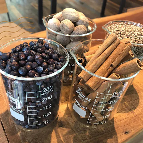 Durante o processo de destilação, cada participante escolhe as próprias especiarias que quer utilizar, o tipo de Gin e no final até o teor alcoólico, tudo em um processo bem minucioso, descontraído e repleto de conhecimento.