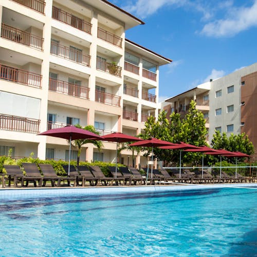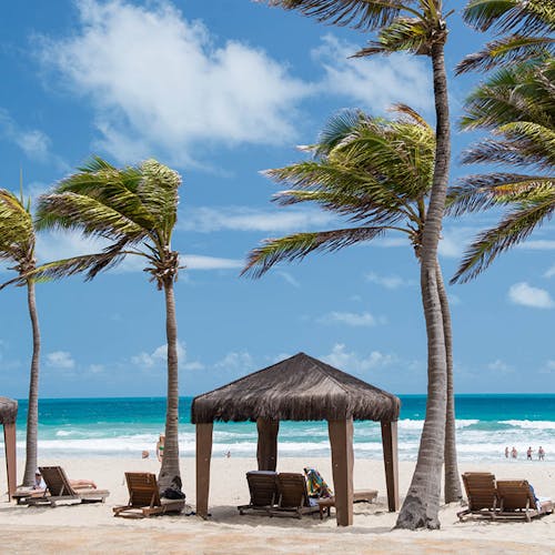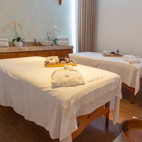 O Espaço Cabanas fica na praia, é para quem deseja relaxar com conforto entre uma diversão e outra. São oito chalés privados com TV, toalhas e frigobar. Custa entre R$ 685 e R$785, com água incluso e R$85 devolvidos ao final da diária.