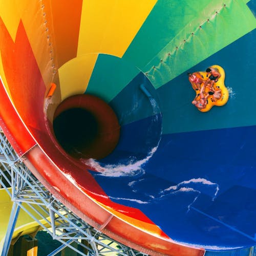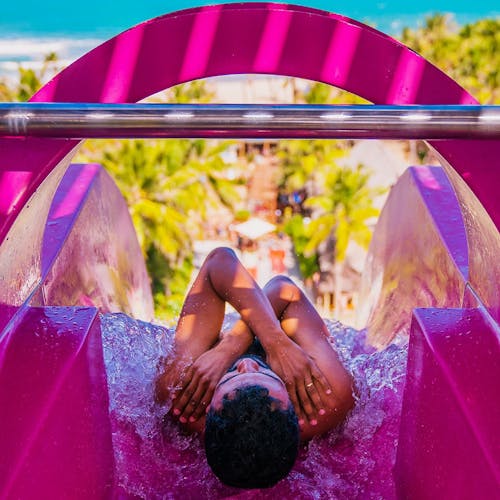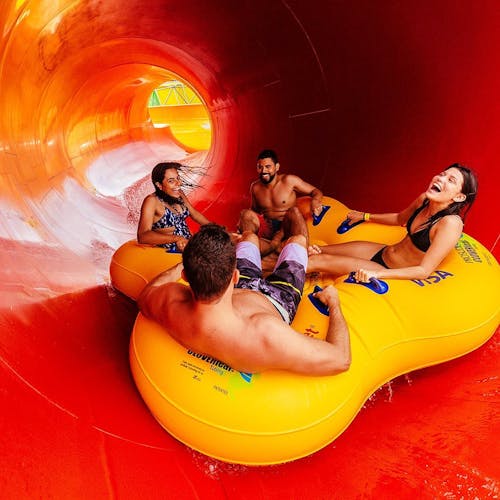 Em várias atrações de tobogã, é possível escolher se vai em boia individual, dupla ou - sem boia nenhuma.