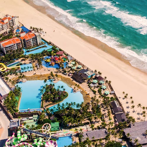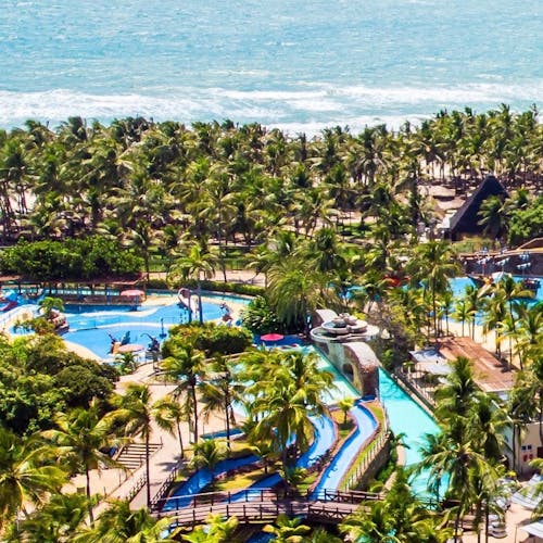 Uma enorme estrutura de 200.000m² conecta o parque aquático, hotéis, resort, restaurantes e praia. Este é o Beach Park Fortaleza, onde a praia de Porto das Dunas fica exatamente em frente.