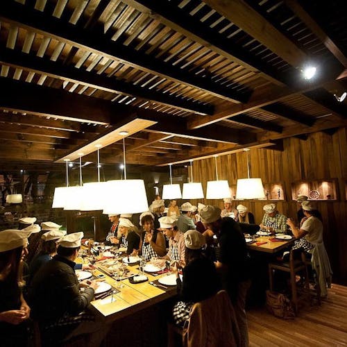 Imagine você chegar pra jantar em um lugar com a mesa repleta de convidados, vocês ganham avental e chapéu de chef.