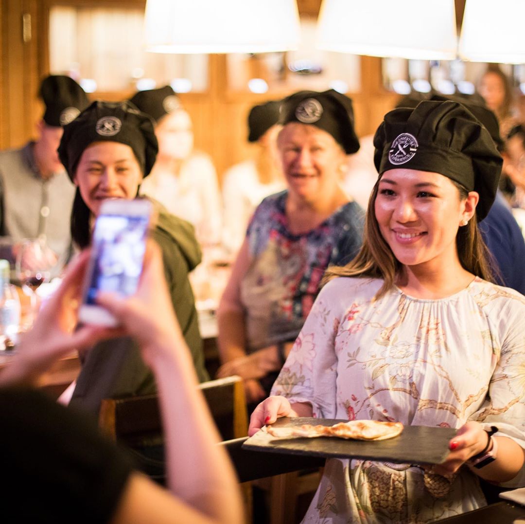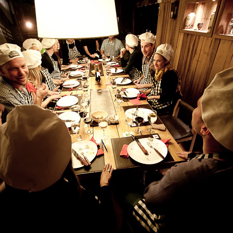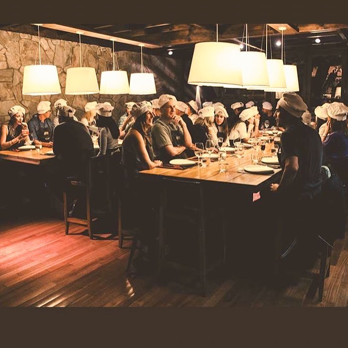Imagine você chegar pra jantar em um lugar com a mesa repleta de convidados, vocês ganham avental e chapéu de chef.