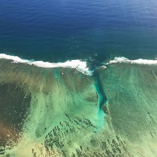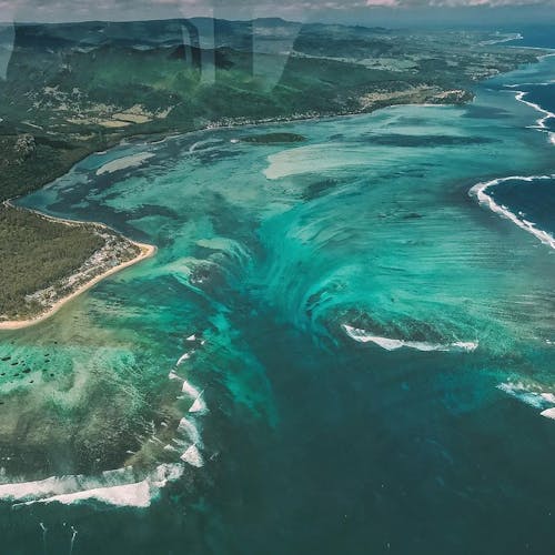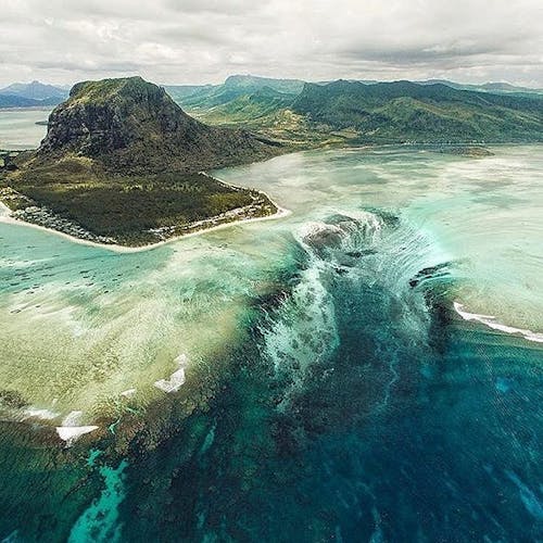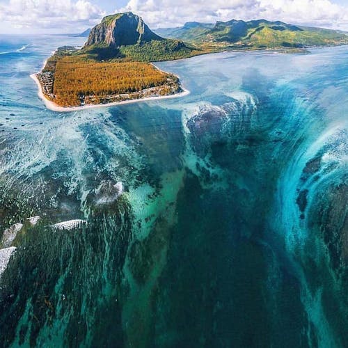 A descoberta fascinante de uma cachoeira subaquática despertou a curiosidade de todos em geral. A ilha onde está localizada a "cachoeira" é conhecida como Península Le Morne, o fenômeno ocorre na lagoa turquesa. Graças às águas cristalinas é possível ver através dela. Ao largo desta costa em particular, uma inclinação gradual é notada, terminando abruptamente em uma queda de 4.000 metros de profundidade. Graças a esta topografia marinha, vários tons de azul são visíveis, devido ao movimento de depósitos de areia e silte ao longo destas encostas. É esta harmonia única de tons que cria a ilusão de ótica que conquistou tantos admiradores em todo o mundo.