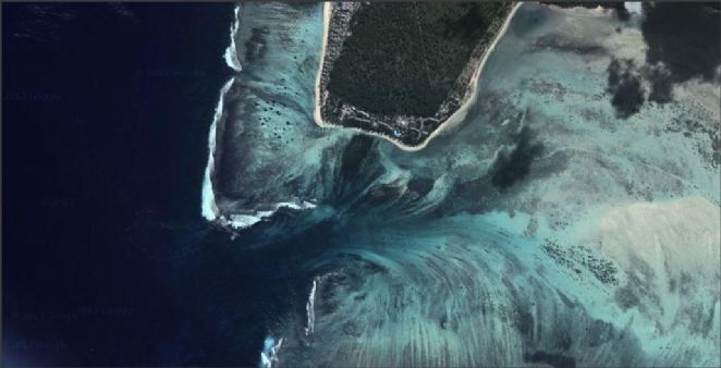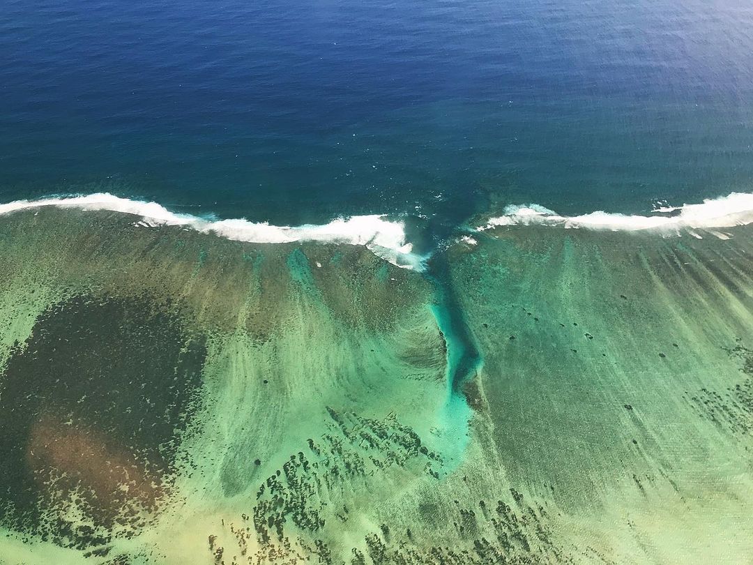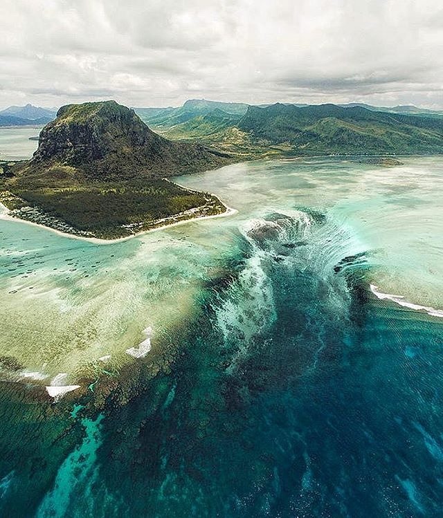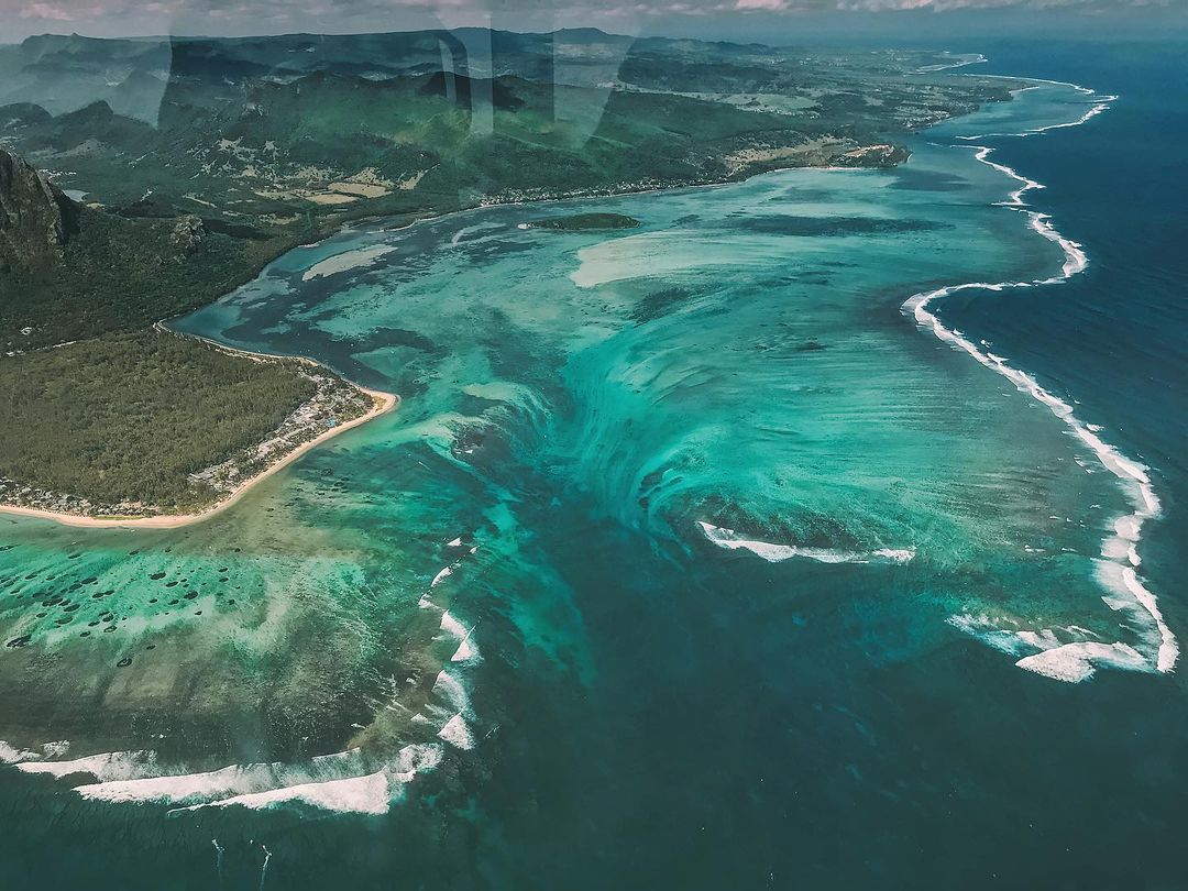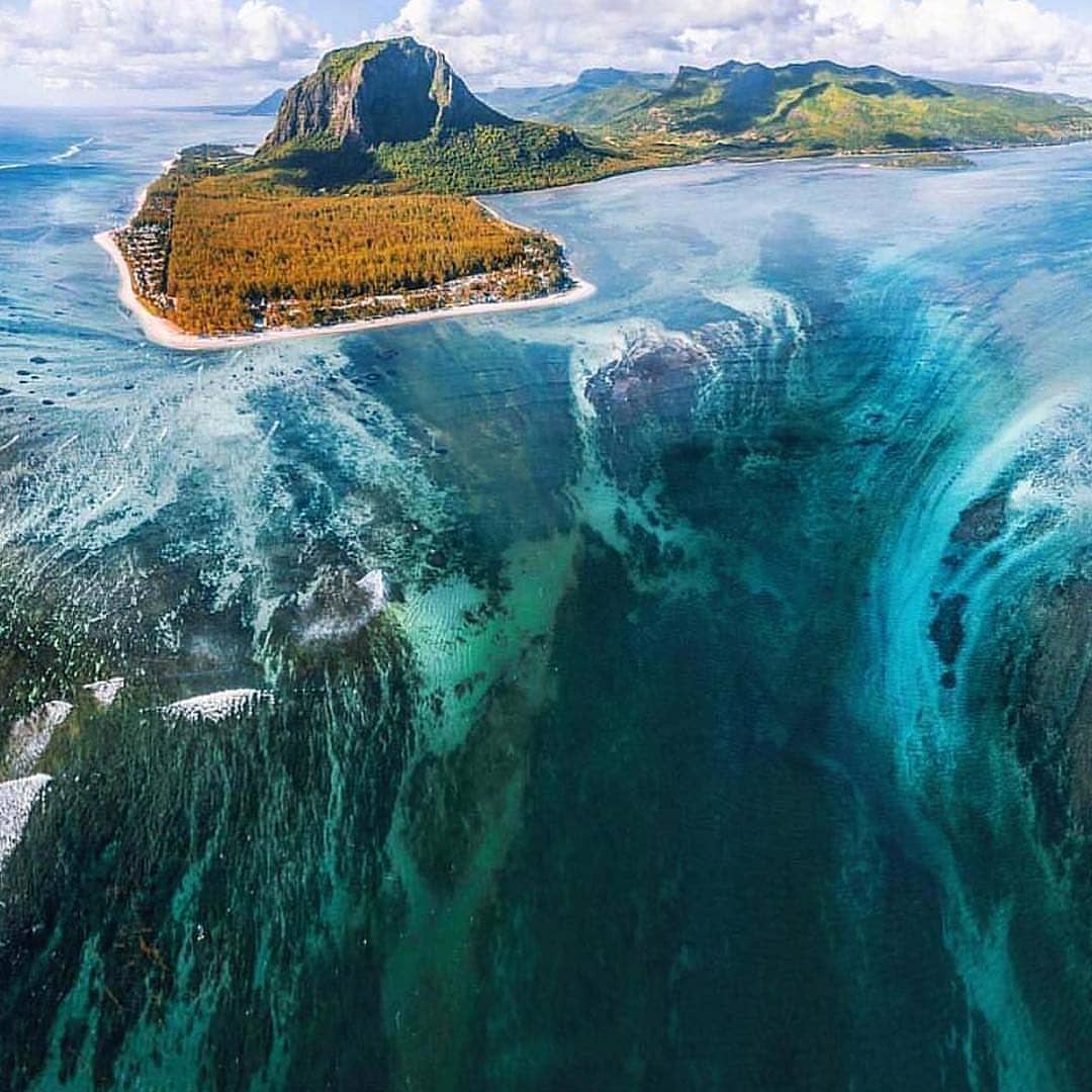 A descoberta fascinante de uma cachoeira subaquática despertou a curiosidade de todos em geral. A ilha onde está localizada a "cachoeira" é conhecida como Península Le Morne, o fenômeno ocorre na lagoa turquesa. Graças às águas cristalinas é possível ver através dela. Ao largo desta costa em particular, uma inclinação gradual é notada, terminando abruptamente em uma queda de 4.000 metros de profundidade. Graças a esta topografia marinha, vários tons de azul são visíveis, devido ao movimento de depósitos de areia e silte ao longo destas encostas. É esta harmonia única de tons que cria a ilusão de ótica que conquistou tantos admiradores em todo o mundo.