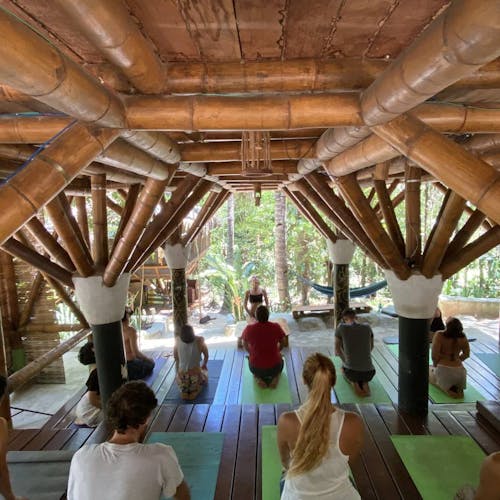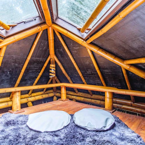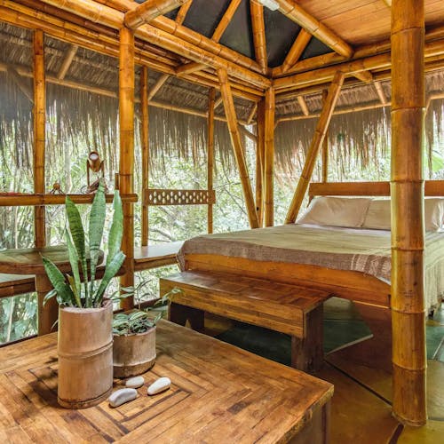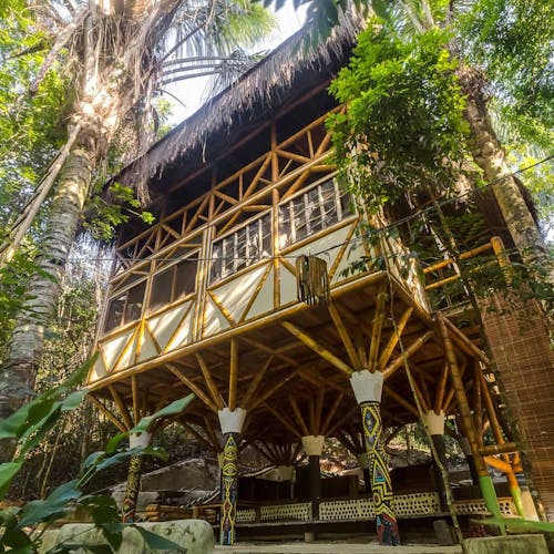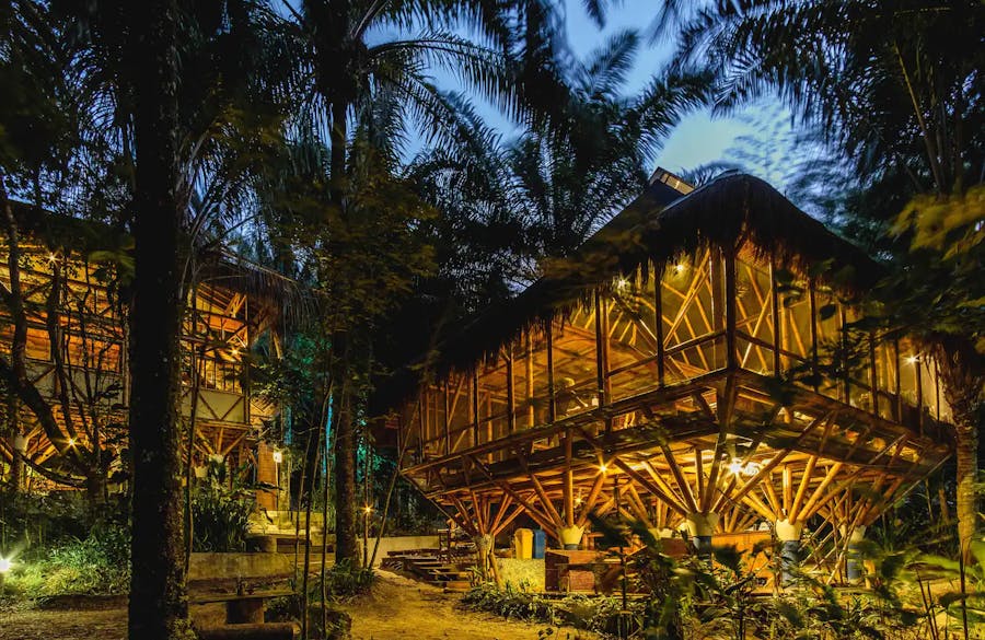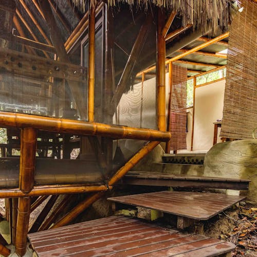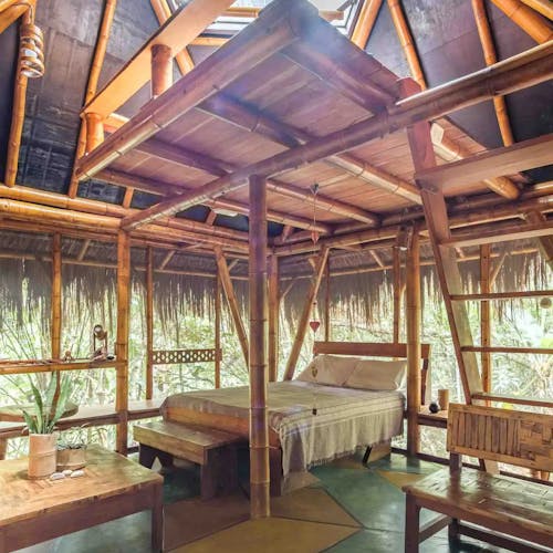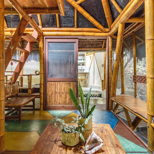 O bambu é o principal material usado na construção, combinando o que há de melhor em tecnologia, ecologia e design, a propriedade foi construída de acordo com os espaços livres para que não houvesse interferência na natureza. O hostel fica imerso em uma ambientação de floresta, muita fauna e flora e animais diversos.