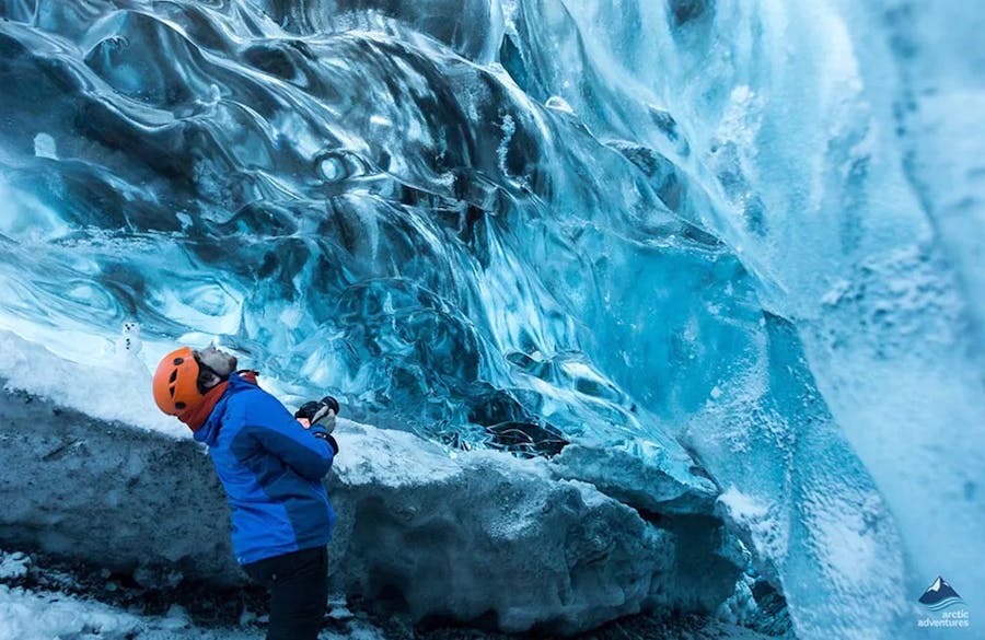 No lugar dela a natureza trouxe uma caverna ainda mais bonita. Com teto azul safira e cores intensas que contam a rica história dos sistemas vulcânicos que estão dentro da geleira. Ao entrar na caverna, você terá a opção de ir para a esquerda ou direita. A esquerda o levará para a parte estreita da geleira, onde pequenos postes congelados parecem estar segurando o teto e lindas cores se misturam com a neve. À direita há um grande buraco no qual você pode entrar. É aqui que você pode ficar de pé e realmente admirar a geleira e sua forma. O “rio congelado” no teto é o mais largo desta parte e durante os meses mais frios do inverno uma cachoeira congelada se forma, onde muitos dos visitantes "escorregam" por ela para chegar até outro espaço.